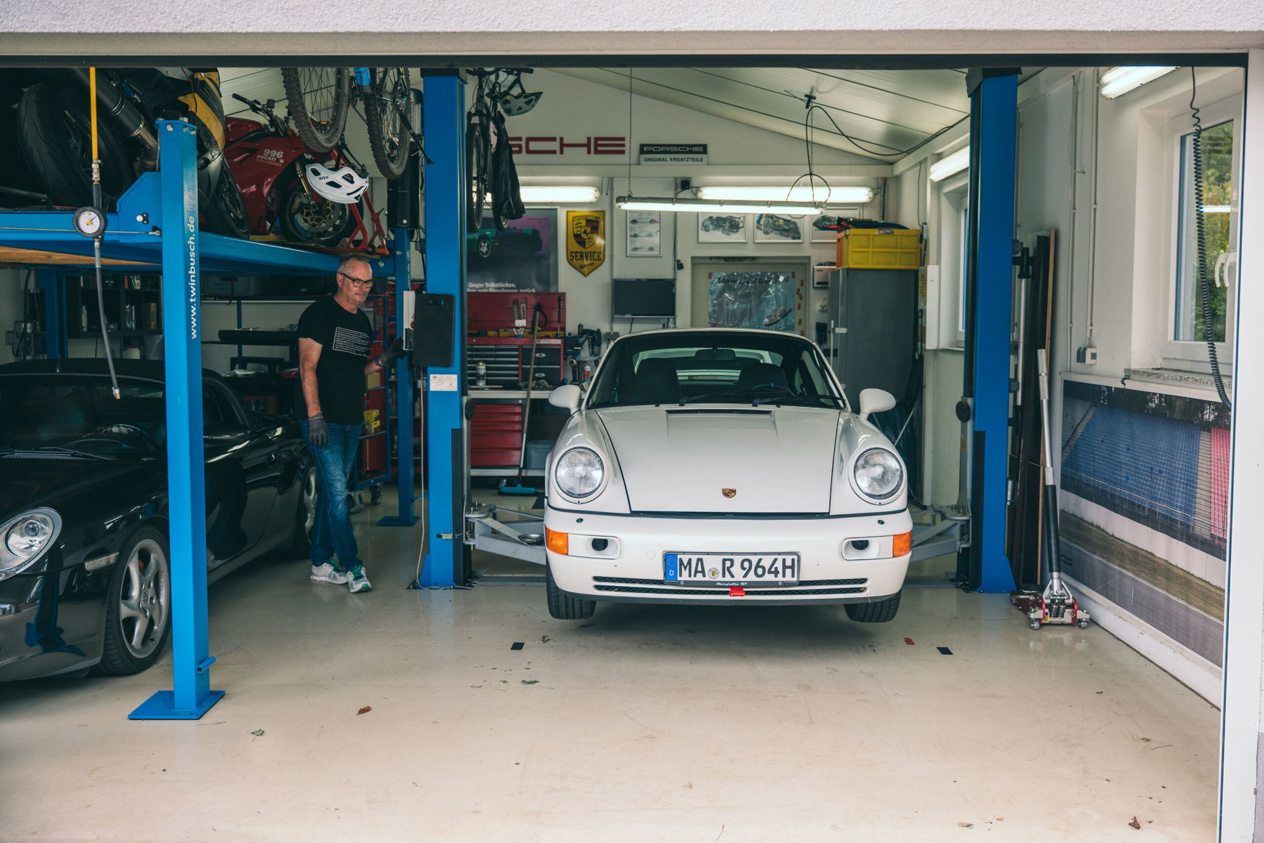 Michael’s garage in Mannheim is a small textbook on efficiency: everything is tidy and sorted, every square centimeter has its function. There are markings on the floor for different vehicles. “This way, every car is perfectly positioned to be lifted.” Next to his white 964 Carrera 4, there is also a Porsche 914 with a 2.6-liter four-cylinder engine in the garage – a private fun project with more than 170 hp. Parked in the driveway is his daughter’s Boxster 986, “an underrated source of joy.” Also on the lift: a BMW and a Ducati – reminders of past motorcycle tours.